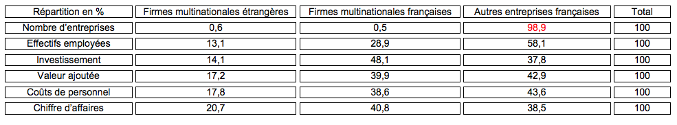 En 2017, 16 800 entreprises sont sous le contrôle de firmes multinationales étrangères en France (1 % des entreprises). Elles emploient en France 2,2 millions de personnes (13 % des effectifs des secteurs concernés) ; ces effectifs incluent environ 400 000 travailleurs intérimaires.45 % de l’emploi en France sous contrôle étranger se concentre dans des entreprises de taille intermédiaire (ETI) et 38 % dans les grandes entreprises : en comparaison, les firmes multinationales françaises concentrent 32 % de leurs emplois en France dans les ETI et 61 % dans les grandes entreprises. Pour les autres entreprises françaises, indépendantes ou sans filiale à l’étranger, un dixième des emplois sont au sein d’ETI ; leurs emplois s’exercent majoritairement dans des microentreprises.