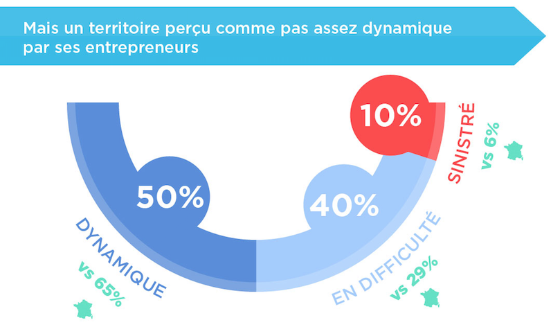 Le jugement des entrepreneurs occitans vis-à-vis du dynamisme de leur région est partagé et en retrait par comparaison à la moyenne nationale. Ainsi, il sont 50 % à juger le territoire dynamique (contre 65 % au national), 40 % à le juger en difficulté (contre 29 %) et 10 % à le juger sinistré (contre 6 %). L’Occitanie fait ainsi partie des territoires français les plus jugés en difficulté.