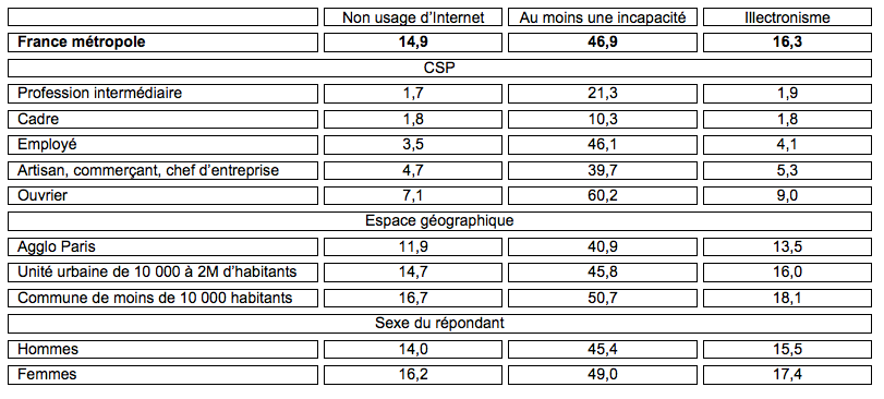 Utiliser Internet ne garantit pas de posséder les compétences numériques de base. 37,9 % des usagers apparaissent manquer d’au moins une compétence dans les quatre domaines que sont la recherche d’information, la communication, l’utilisation de logiciels et la résolution de problèmes.Le défaut de compétence le plus répandu concerne l’usage de logiciel (34,5 %) devant la recherche d’information (10,7 %), la résolution de problèmes (8 %) et la communication (7,5 %). Parmi les usagers d’Internet :