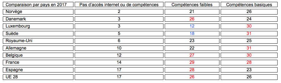 En France, en 2017, 43 % des individus de 16 à 74 ans (tranche d’âge commune à toutes les enquêtes européennes) avaient un score global de capacité numérique nul ou faible, ce qui place le pays dans la moyenne de l’Union européenne (données Eurostat) : la population des pays du nord est quasiment équipée (Norvège, Danemark, Suède, entre 95 et 98 %, voire le Royaume-Uni avec 94 %) ; l’Allemagne, la Belgique et la France ont un taux d’équipement de 86 à 90 %.Cette distribution reflète à la fois le niveau de développement économique des pays, leur pyramide des âges, leur densité de population et l’hétérogénéité de leur territoire.