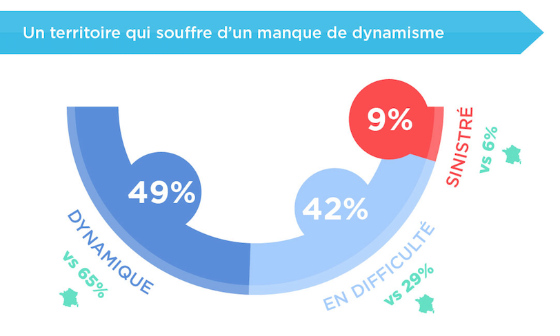 Le jugement des entrepreneurs vis-à-vis du dynamisme de leur région est partagé et en retrait par comparaison avec la moyenne nationale. Ainsi, il sont 42 % à juger le territoire en difficulté (contre 29 % au national), 49 % à le juger dynamique (contre 65 %) et 9 % à le juger sinistré (contre 6 %). La région Centre-Val de Loire fait ainsi partie des territoires français les plus jugés en difficulté, après les Hauts-de-France et avant l’Occitanie.