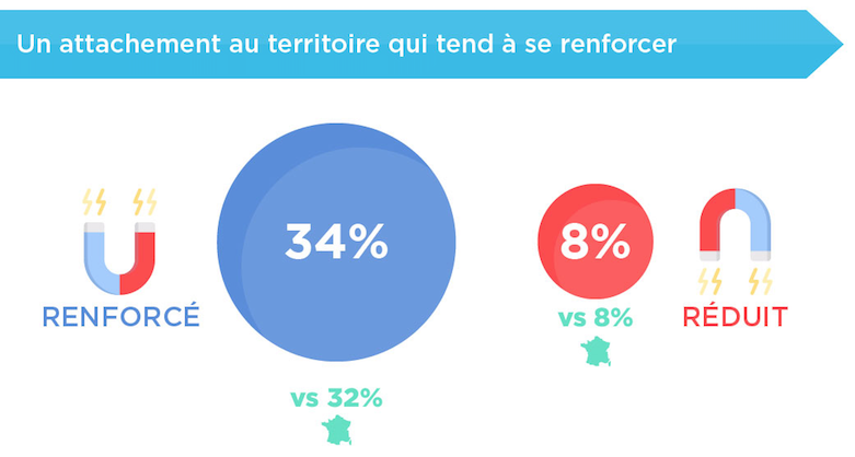 Le lien qu’entretiennent les entrepreneurs de Provence-Alpes-Côte d’Azur avec leur territoire est puissant et durable puisque, pour plus de 9 entrepreneur sur 10, ce lien s’est renforcé (34 %) ou maintenu (58 %). Il s’est réduit pour seulement 8 % d’entre eux.