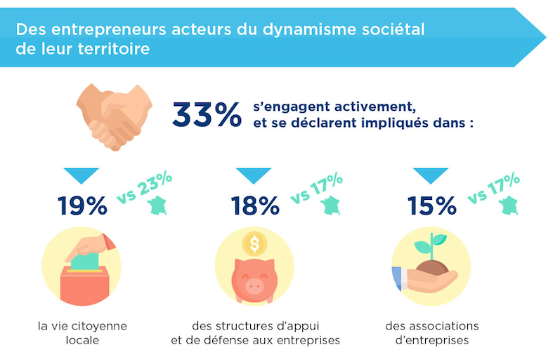 Les entrepreneurs de la région sont majoritairement acteurs du dynamisme de leur territoire. Ils sont plus de 33 % à déclarer s’investir activement (intensément ou assez fortement) dans des domaines tels que la vie citoyenne locale, les associations d’entreprises ou encore les structures d’appui et de défenses aux entreprises.