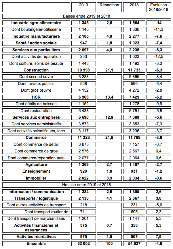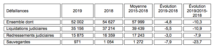 Source : "52 002 défaillances d’entreprises en France en 2019 dont 13 514 au 4e trimestre ",Altares, communiqué de presse du 21 janvier 2020