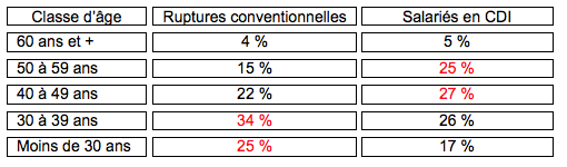 Elles sont davantage le fait des moins de 40 ans (59 %) alors que les salariés en CDI de cette tranche d’âge sont 43 % des CDI ; les 50 ans et plus ne concernent que 19 % des ruptures conventionnelles mais 30 % des CDI.