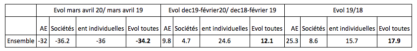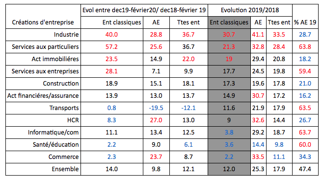 L’année 2019 a été particulièrement favorable au regard de 2018 (+17,9 % dont +25 % pour les autoentrepreneurs et +15,7 % pour les autres entreprises individuelles) ; la période de début d’année (décembre-février) l’a été un peu moins (+12 ,1 %, bien plus favorable aux entreprises individuelles avec +24,6 % vs 9,8 pour les autoentrepreneurs) ; noter que l’évolution des créations en société est toujours modeste (4,7 % à 8,6).