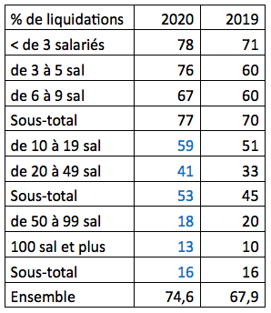 De fait les plus petites entreprises sont nettement plus liquidées que les tailles supérieures. Le taux de liquidation en 2020 est de fait plus important qu’en 2019 (77 % vs 70, mais surtout dans la tranche des 3-5 salariés 76 % vs 60).