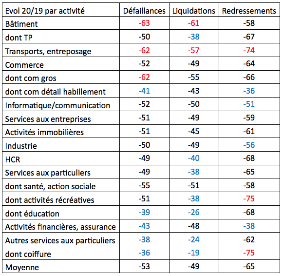Dans certaines activités les liquidations sont plutôt proches de 2019, alors que les redressements sont nettement moins nombreux (exemples de la coiffure, de l’éducation, des activités récréatives, des travaux publics…).