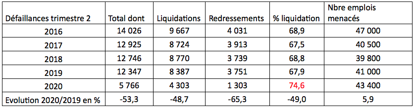 Source : "Défaillances et sauvegardes d’entreprises en France 2ème trimestre 2020", Altares, juillet 2020