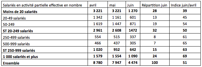 En ce qui concerne les tranches de taille, les moins de 20 salariés (1,270 million) sont 28 % des salariés en activité partielle effective, les 20-249 salariés (1,472 million) 32 %, et les 250 salariés et plus (1,732 million) 39 %. Plus la taille augmente, plus le % de salariés en activité partielle de juin comparé à avril augmente (de 39 à 69 %).