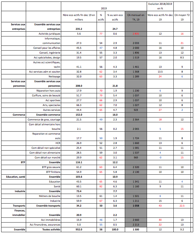 Ces entreprises ont cumulé au cours du 4éme trimestre 2019 un chiffre d’affaires de 4,3 Md€ contre 3,5 Md€ en 2018. Le chiffre d’affaires mensuel moyen est de 1 500 € (duquel il faut déduire les charges sociales, quelques frais et des achats pour ceux qui font de la revente en l’état).