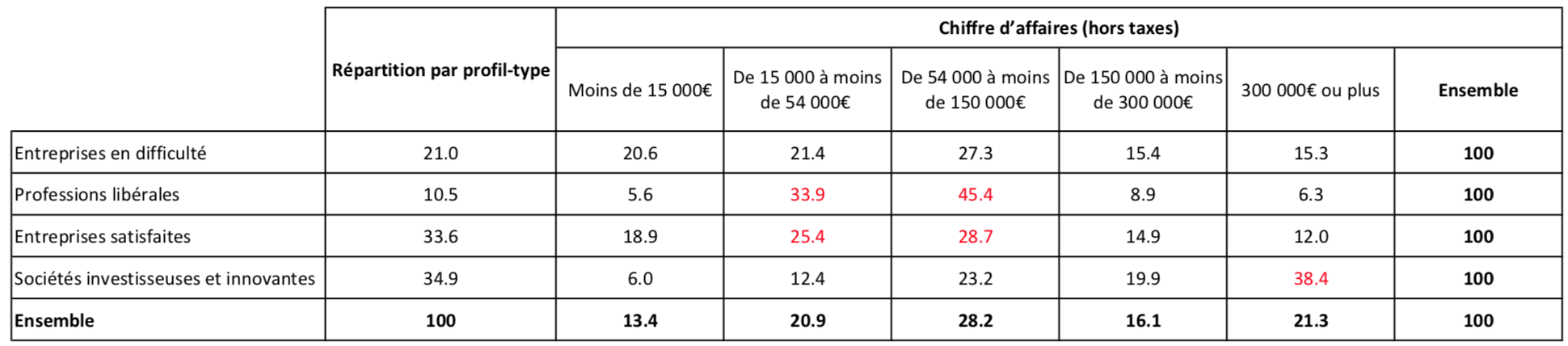 - Les « sociétés investisseuses et innovantes » (35%) : 89% sont en société (vs en moyenne 66,5%). Les entreprises du commerce sont légèrement surreprésentées (21%, contre 19), de même que les entreprises des activités spécialisées, scientifiques et techniques (17% contre 15). On n’y trouve moins les entreprises de construction et les libéraux de la santé/éducation.