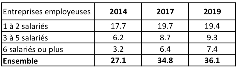 Le fait d’être employeur a assez peu évolué depuis le démarrage, passant de 27 à 36% des entreprises ; il serait intéressant de connaitre la progression des effectifs salariés, ce que les données de l’enquête pourraient permettre d’observer, mais qui ne figure pas ici :