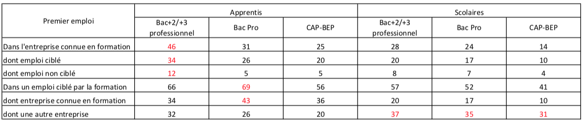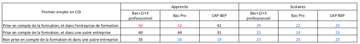- Enfin un 4éme profil beaucoup moins fréquent, celui des embauchés dans l’entreprise où ils ont connu leur apprentissage, mais où ils n’ont pas été embauché pour leur diplôme (12% en bac+2/3, 5% pour les autres). Idem pour les scolaires (entre 4 et 8%).