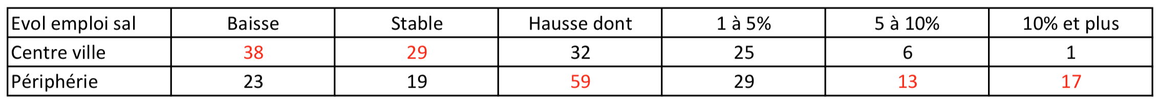 Quand il y a hausse de la population, l’emploi salarié progresse de 66% dans les pôles de périphérie (vs 42 pour le centre ville).