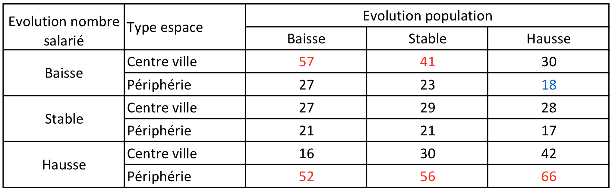 Quand il y a baisse de la population, l’emploi salarié des commerces baisse davantage en centre ville (57% vs en périphérie 27), alors qu’il progresse même de 52% en périphérie (vs 16 en centre ville).