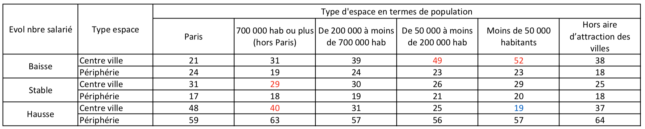 En centre-ville, quand il y a baisse des effectifs salariés, celle-ci est beaucoup plus sensible dans les villes de moins de 50 000 habitants (baisse de 49-52% vs 21 pour l’agglomération Paris et 31% les autres agglomérations de plus de 700 000 habitants), alors qu’en périphérie la baisse est proche (entre 19 et 24%).