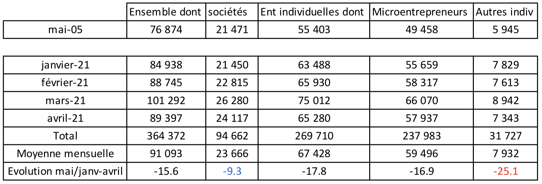 Par contre les créations ont diminué entre mai et avril 2021 : 14% pour l’ensemble, 11% pour les sociétés, 14,6% pour les microentrepreneurs et 19% pour les autres entreprises individuelles.