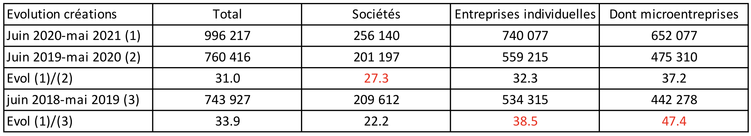 Les créations nouvelles entre juin 2020 et mai 2021 ont globalement progressé de 31% au regard des 12 mois antérieurs, 27% pour les sociétés et 37% pour les microentreprises ; cette progression a été plus forte entre la période juin 2020-mai 2021 et juin 2018-mai 2019 respectivement 34, 22 et 47%.