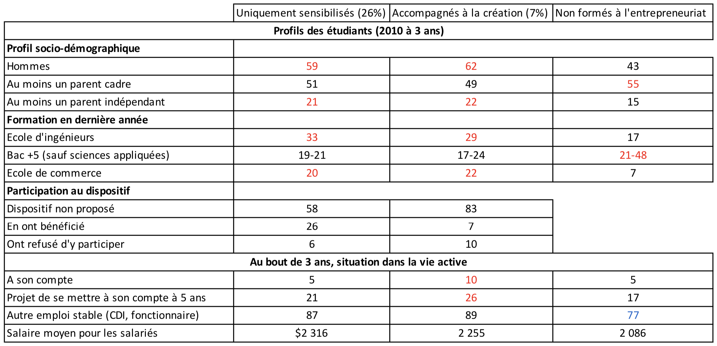Même si elle ne se traduit pas par une création d’entreprise (plus d’emploi stable, une meilleure rémunération).Dommage que l’étude n’a pu interroger sur leur comportement de salarié, mon expérience d’enseignant en ce domaine m’ayant montré un comportement plus entrepreneurial apprécié de leur employeur, qui a facilité leur recrutement et leur promotion au sein de l’entreprise, pourvu que l’employeur soit lui-même imprégné du comportement entrepreneurial !