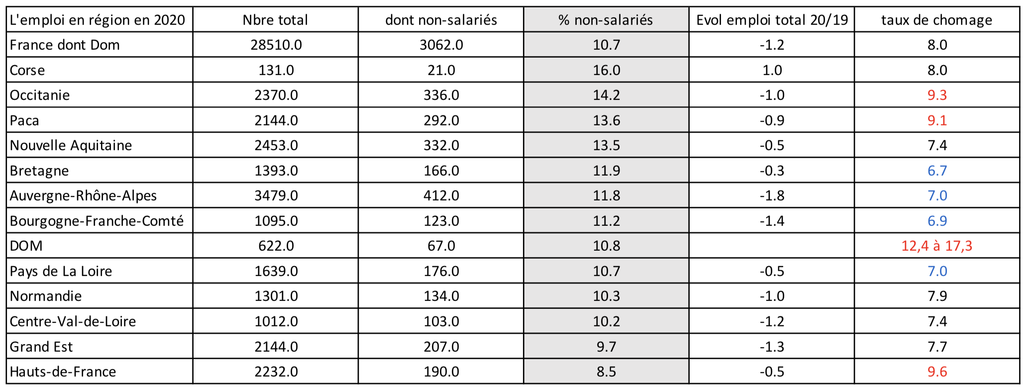 L’observation par régions en ce qui concerne l’importance des non-salariés fait état de 3 espaces géographiques différents, l’un au nord et à l’est avec un poids compris entre 8,5 et 10%, un autre au centre (entre 10 et 12%) et le dernier au sud entre 12 et 16% des emplois.