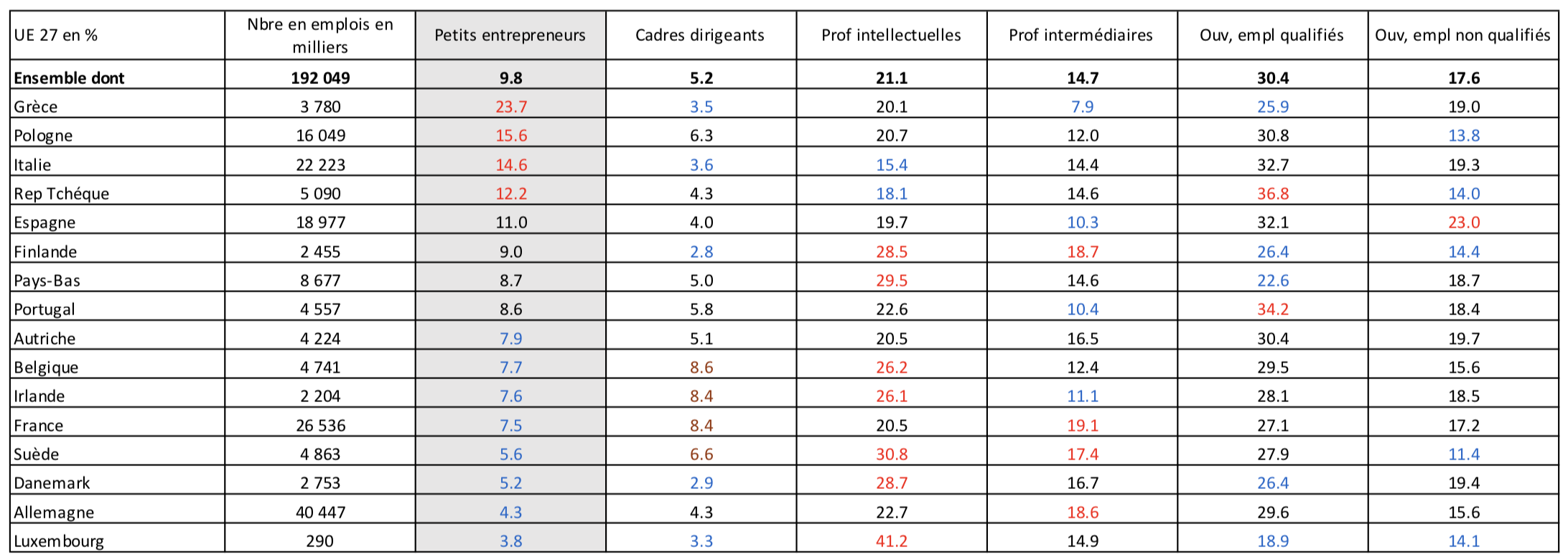 - Parmi 192 millions de personnes en emploi en UE27, 5,2% sont cadres dirigeants selon la nomenclature ESeG (entre 2,6% en Roumanie,10% dans les pays baltes et 11,3% à Malte, vs 8,4% en France, mais 4,3% en Allemagne). Un peu moins de 30% des cadres dirigeants sont chefs d’entreprise, les autres sont salariés.- Les petits entrepreneurs (exploitants agricoles, commerçants et artisans) représentent 9,8% des Européens en emploi. Ils sont un peu moins nombreux dans la plupart des pays du Nord (6,7% en moyenne) et de l’Ouest (6,1% en moyenne). Leur part est de 7,5% en France vs 4,3% en Allemagne et 3,8% au Luxembourg, mais plus de 20% en Roumanie et en Grèce et un peu moins de 15% en moyenne dans les autres pays du Sud et de l’Est. Parmi ces petits entrepreneurs, dans la plupart des pays de l’Est et des pays baltes, ainsi qu’en Autriche, en Irlande, en Croatie, en Grèce et en Slovénie, les exploitants agricoles sont surreprésentés.