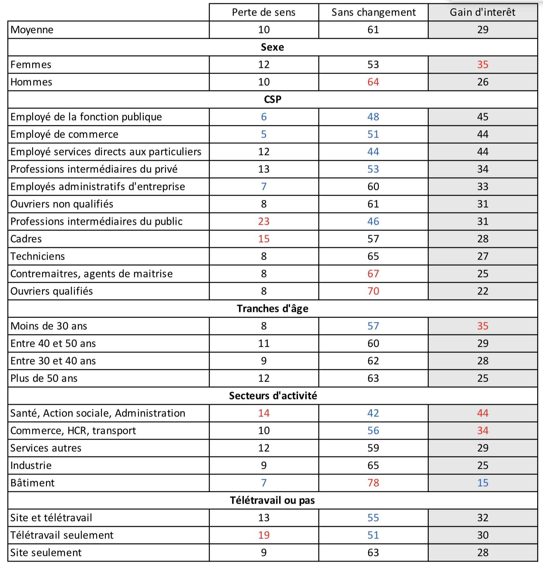 « Du fait de la crise sanitaire, avez-vous le sentiment que votre travail perd [ou a perdu] de son sens ? » et du gain d’intérêt « Du fait de la crise sanitaire, avez-vous le sentiment que votre travail gagne [ou a gagné] en intérêt ? »