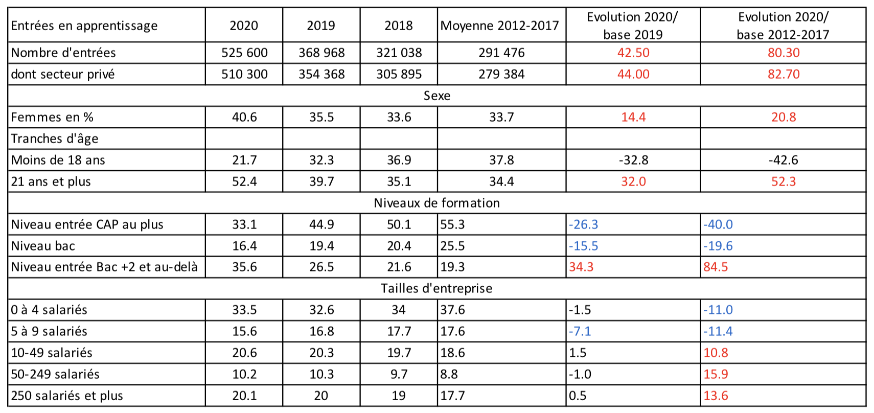 En 2020, le nombre d’entrées en apprentissage est estimé à 525 600 et augmente de 42% par rapport à 2019. Cette hausse est presque portée par le secteur privé (+44%), alors que le public ne progresse que de 5%.C’est la part des contrats de niveau Bac+3 à Bac+5 qui s’accroît le plus entre 2019 et 2020 (de 26 à 35%), alors que la part des niveaux équivalents au CAP et moins se replie nettement (de 45 à 33%).