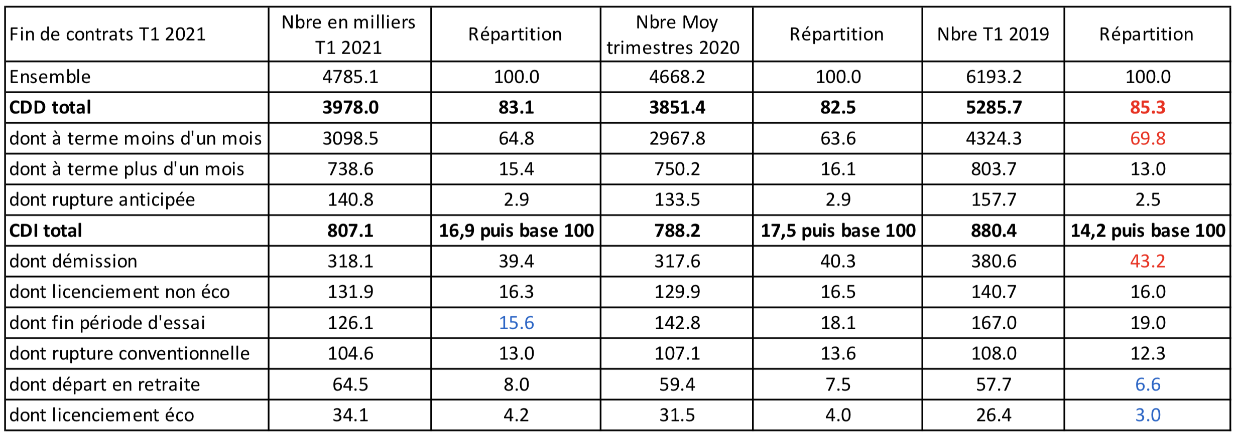 Pendant le 1er trimestre 2021, on constate 4 785 100 fins de contrat, dont 83% en CDD (au sein desquels 65% sont des CDD de moins d’un mois) et 17% en CDI.