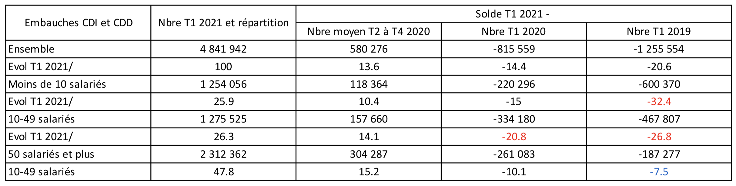Si l’évolution entre le 1er trimestre 2021 et les trimestres 2, 3 et 4 de 2020 (ceux où le covid est en cours) est proche, quelle que soit la taille (entre +10,4 et +15,2%), elle diffère davantage quand on compare avec le 1er trimestre 2020 (en moyenne -14% mais -10 pour les 50 salariés et plus et -21% pour les 10-49 salariés) ou encore la comparaison avec le 1er trimestre 2019 (moyenne de -21% mais -32% pour les moins de 10 salariés et -7,5% pour les 50 salariés et plus)