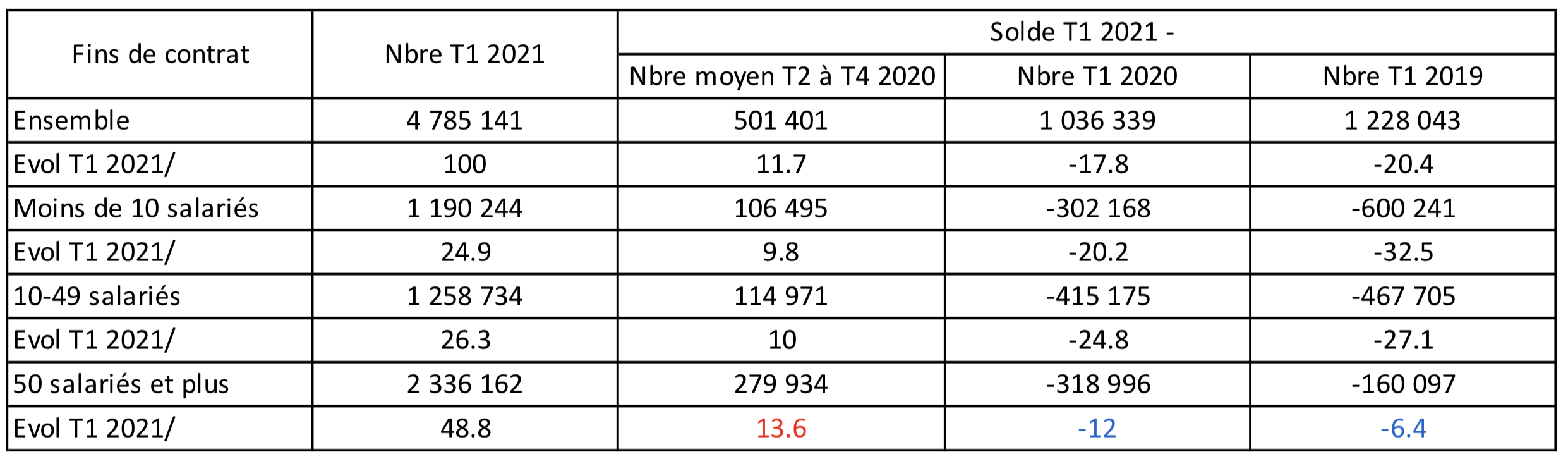 Du coté des tailles d’entreprise, les 50 salariés chiffrent 49% des fins de contrat, les 10-49 salariés 26% et les 1-9 salariés 25%. Les 50 salariés et plus sont ceux qui ont connu une hausse plus forte entre le 1er trimestre 2021 et la moyenne des trimestres 2,3 et 4 de 2020 et les écarts les plus faibles avec les périodes précédentes (notamment au regard de la comparaison entre le 1er trimestre 2021 et le 1er trimestre 2019 : -6,4% vs -27 à -32 pour les autres tailles), montrant une modalité différente de gestion des RH.