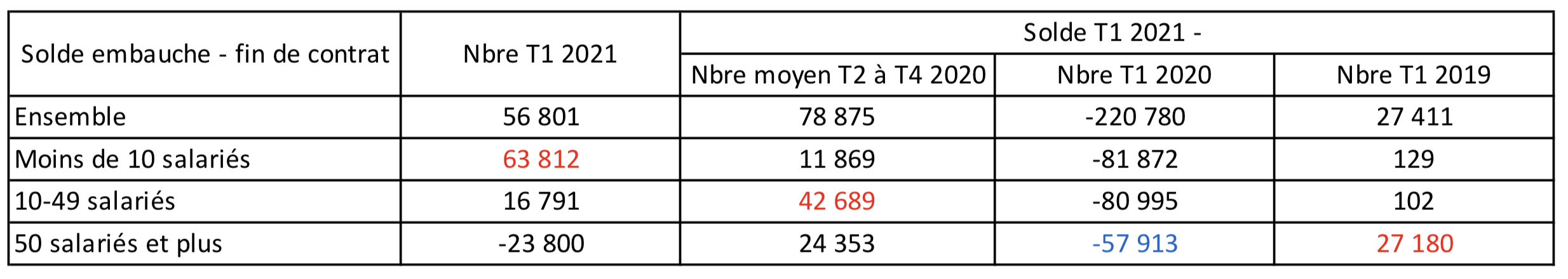 Le solde embauches-fins de contrat par tranche de taille montre que les plus petites tailles ont un solde positif plus important au 1er trimestre 202, alors que les 10-49 salariés ont un solde moins négatif quant aux trimestres 2, 3,4 de 2020. les 50 salariés et plus faisaient état d’un solde bien plus positif au 1er trimestre 2019.