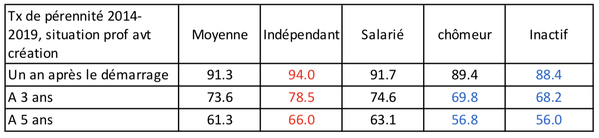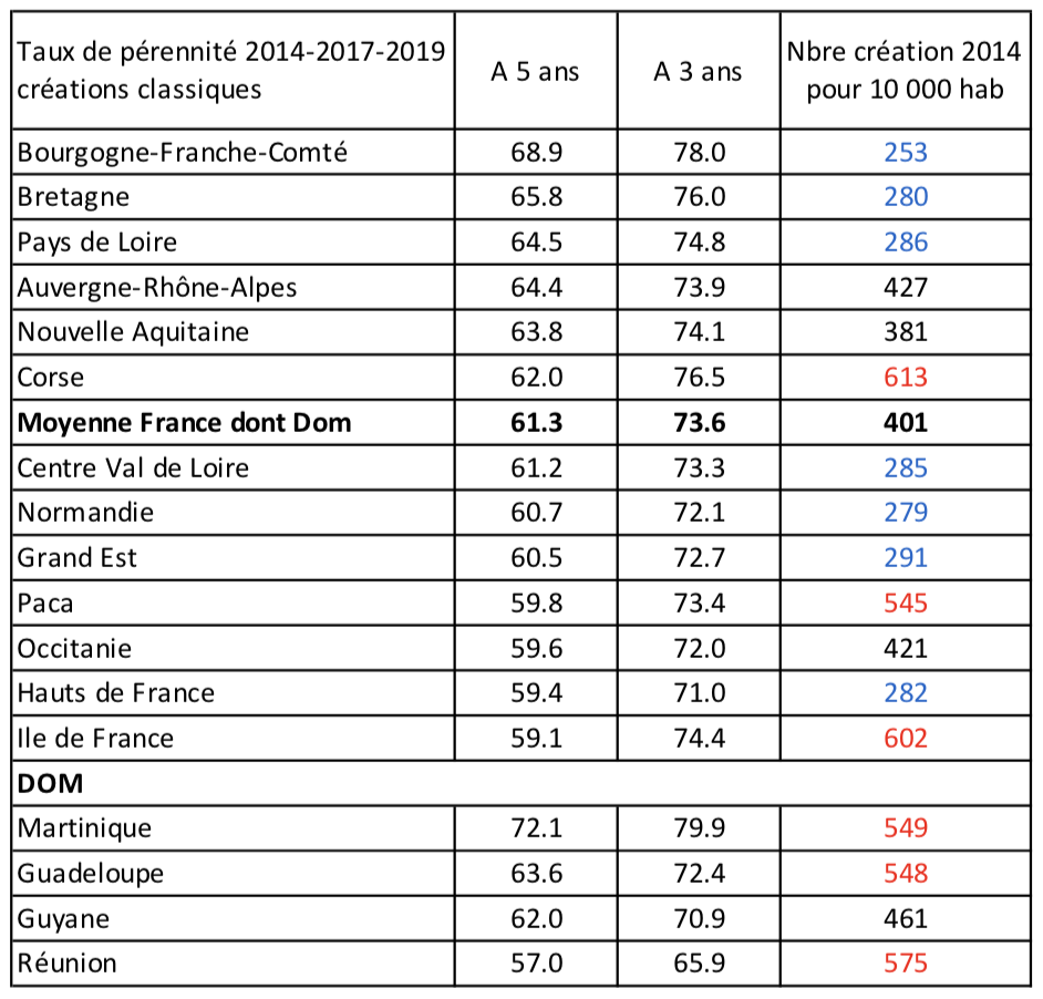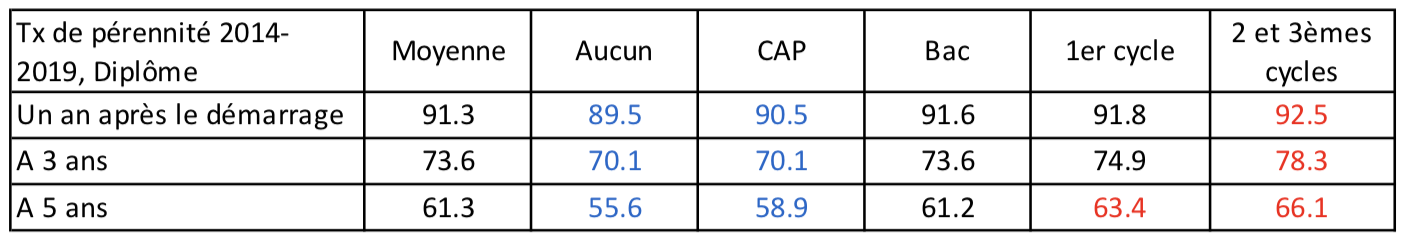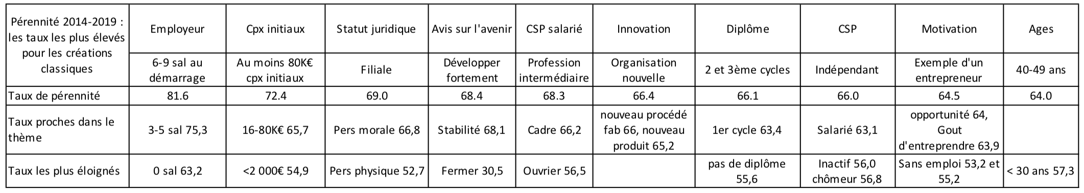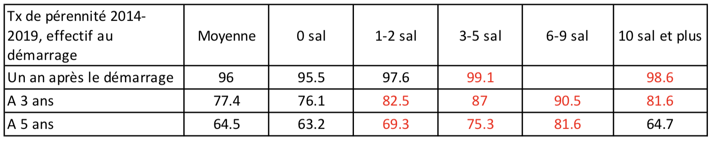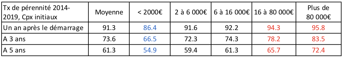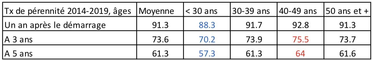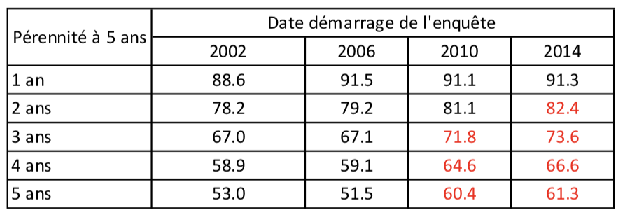 Le taux de la génération 2014-2019 est de 61,3% vs 60,4 pour la génération 2010-2015, 51,5% pour celle de 2006-2011, et de 53% pour celle de 2002-2007. Oublié donc le taux de pérennité souvent cité de 50% à 5 ans.L’amélioration est nettement lisible à partir de 3 ans : 73,6% pour la génération 2014-2019, vs 67% pour celles de 2006-2011 et 2002-2007.