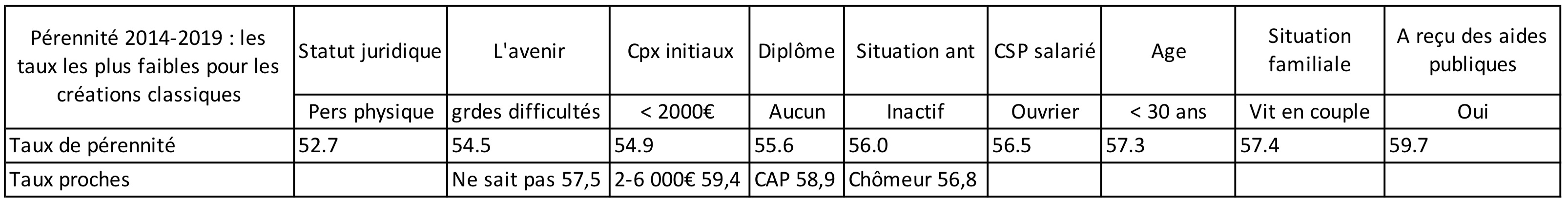 ♦ Certaines caractéristiques ont des taux proches de la moyenne : exemple le taux de pérennité à 5 ans des hommes et des femmes (61,8 vs 60,2%), mais plusieurs items à priori sont surprenants : le fait d’avoir ou non déjà crée (jamais 60,6%, une fois 63,4 et plusieurs fois 62,9), le recours à l ‘innovation (nouveau procédé de fabrication oui 66 non 64,3%, le recours à de nouveaux produits/services oui 65,2 non 64%, le recours à une organisation nouvelle oui 66,4 non 64,1%, l’innovation marketing oui 65,1, non 64,4) et par ailleurs le fait d’avoir bénéficié d’aides publiques, notamment pour les chômeurs (oui 59,7, non 62,7); sans doute leur appréciation doit-elle se faire au regard de cibles plus fines.