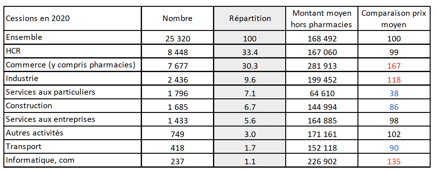 Elles sont au nombre de 25 320, à, comparer à 300 050 créations hors microentrepreneurs, avec un prix moyen hors pharmacies de 168 492€ et un prix médian de 95 000€.♦ Les activités dominantes en nombre sont localisées dans les HCR avec 8 448 cessions (33,4%), le commerce avec 7 677 ventes (30,3%), puis les services avec 3 466 ventes (13,7%) dont services aux particuliers avec 1 796 entreprises (majoritairement des salons de coiffure ou de beauté) et 1 670 de services aux entreprises, puis l’industrie (2 436, 9,6%) et la construction (1 685, 6,7%).