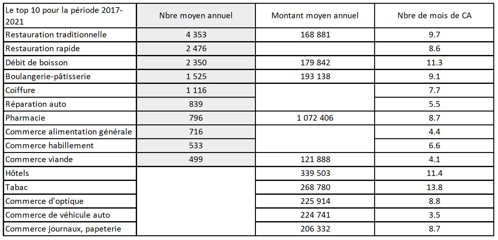 Dans le top 10 des activités en moyenne entre 2017 et 2020, on retrouve la restauration traditionnelle (4 353 reprises) et la restauration rapide (2 476), les débits de boisson 2 350 cessions. Deux autres activités comptent plus d’un millier de transmissions : la boulangerie pâtisserie (1 525) et la coiffure (plus de 1 116).