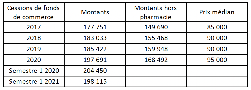 ♦ Leur valeur augmente (+6,6% au regard de 2019 et + 11,2% au regard de 2017) pour atteindre 198 000€ en 2020, un montant qui varie fortement selon les secteurs d’activité. Le prix de cession a même dépassé la barre des 200 000€ sur le 1er semestre 2020 avant de repasser juste sous ce seuil au cours du 1er semestre 2021.