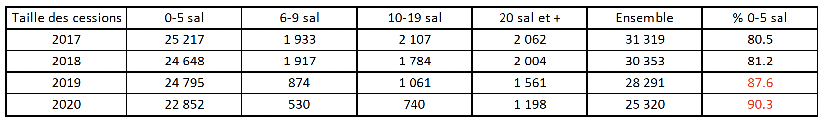 ♦ Selon la taille d’entreprises : une baisse notoire des 5 salariés et plus avec – 60% vs -9,4% pour les 0 à 5 salariés, qui sont passés de 80,5% des cessions en 2017 à 90,3% en 2020. Notez les très fortes baisses 2017-2020 pour les 6-9 salariés (-73%), pour les 10-19 salariés (-65%) et pour les salariés et plus (-42%).