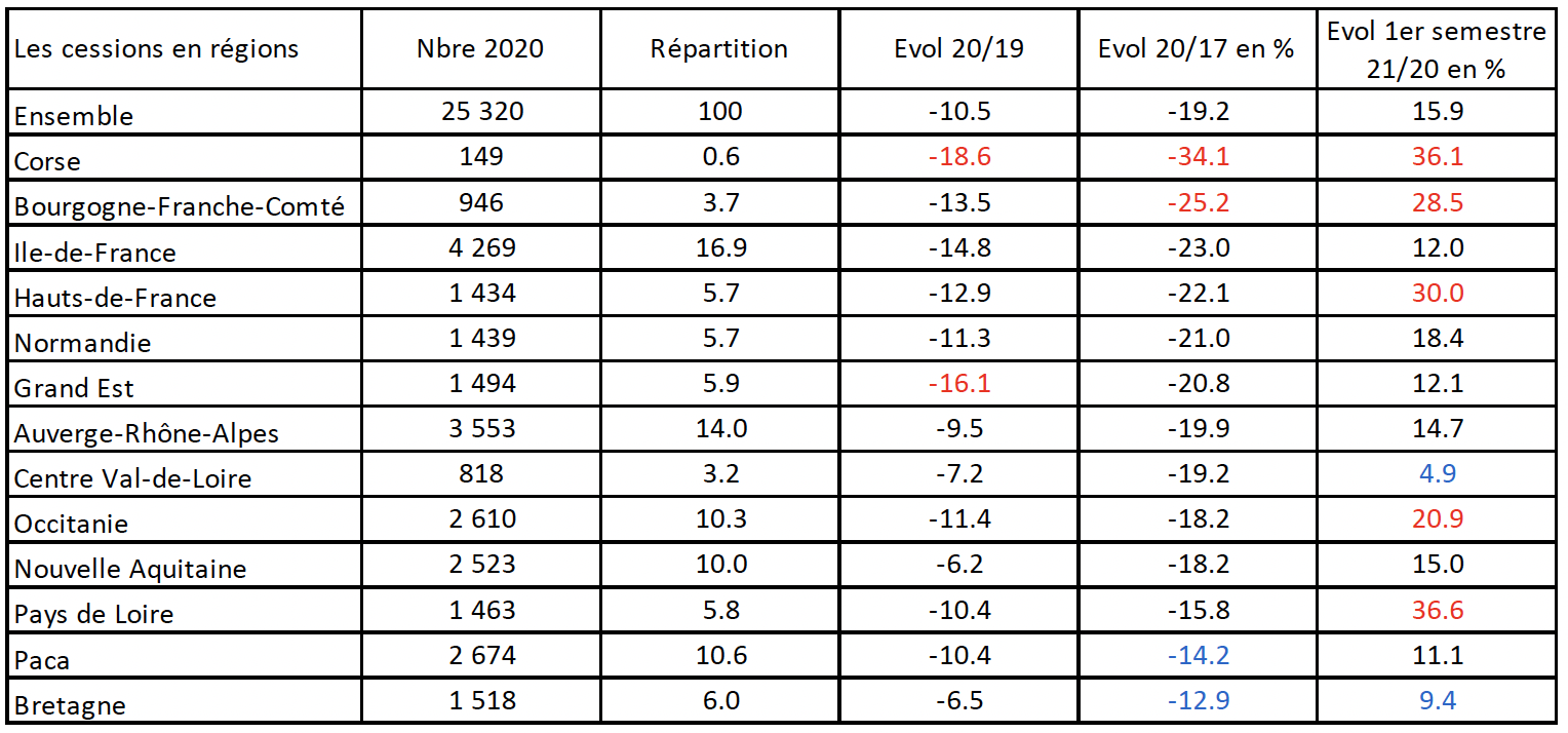 En termes de nombre de cessions, les situations les moins défavorables sont localisées dans le sud et dans l’ouest.