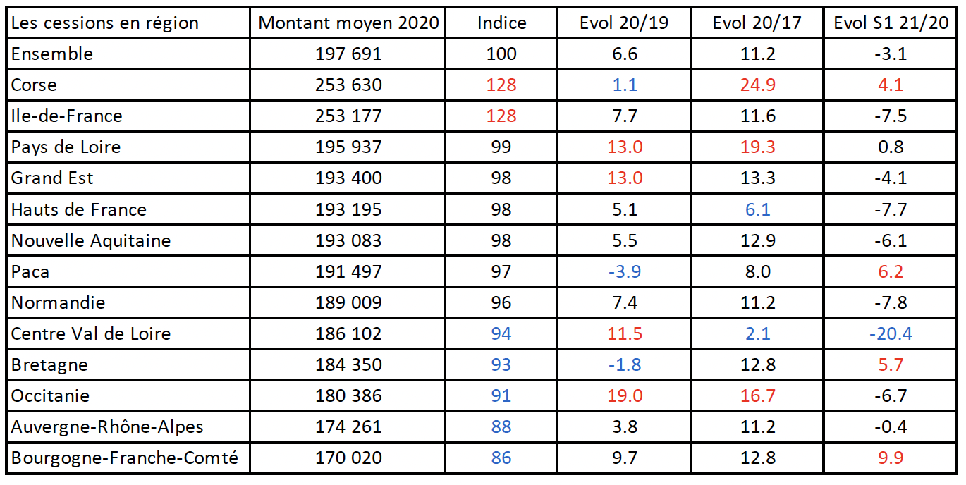 En montants des transactions : noter une grande proximité entre les régions en ce qui concerne les montants moyens 2020 (exception de la Corse et de l’Ile-de-France d’une part, de l’Auvergne-Rhône-Alpes et Bourgogne-Franche-Comté d’autre part).