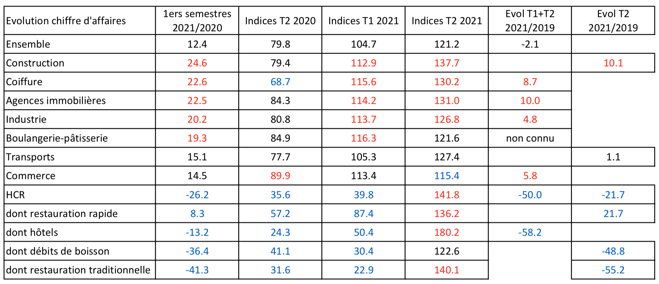 Les activités construction, coiffure, industrie et agences immobilières et boulangeries-pâtisseries ont connu de fortes hausses au 1er semestre 2021 au regard de 2020, contrairement aux HCR (exception des débits de boisson), en reprise mais partant d’une situation 2020 fort dégradée.