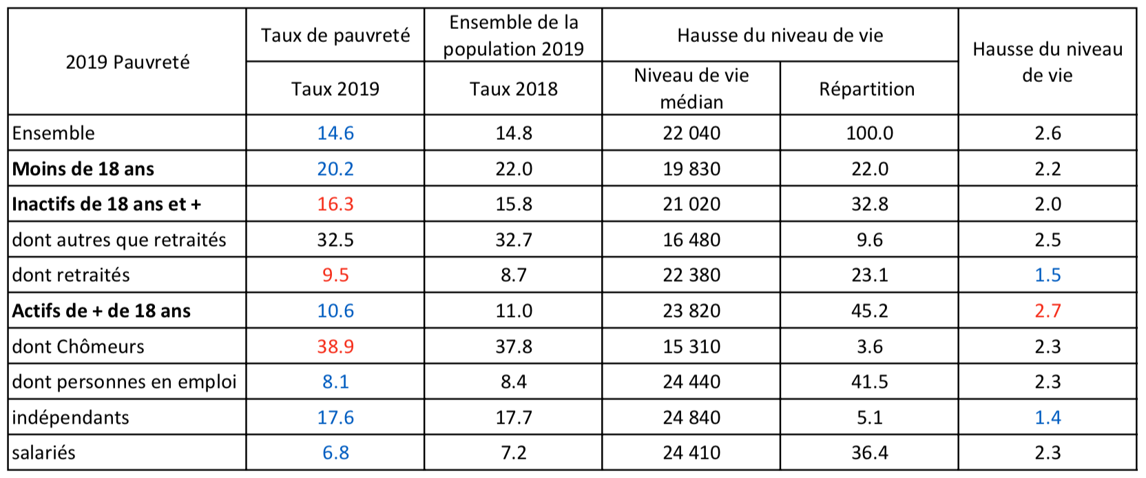 En 2019, la baisse du taux de pauvreté est plus forte pour les familles monoparentales, alors que le taux de pauvreté des retraités et des chômeurs augmente. Globalement, l’évolution de ce taux est plus favorable pour les personnes emploi, parce que ces évolutions interviennent dans un contexte de nette baisse du taux de chômage (toutefois moins importante pour les ouvriers).