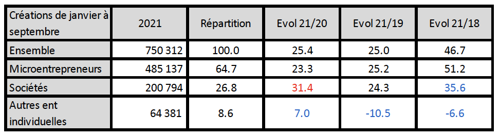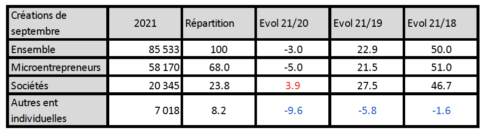 Les créations de septembre ont été au nombre de 85 533 dont 68% de microentrepreneurs. Globalement, elles sont en diminution au regard de septembre 2020 de 3%, dont de 5% chez les microentrepreneurs, mais en hausse de 3,9% pour les sociétés..png)