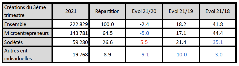 Les créations du 3ème trimestre sont aussi en légère baisse de 2,4% dont 5% pour les microentrepreneurs mais une progression de 5,5% pour les sociétés, manifestant une situation plutôt nouvelle pour les sociétés.