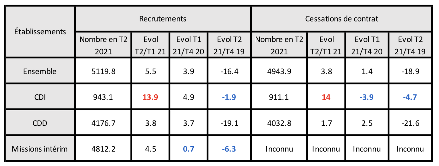 Pour en savoir davantage : Les embauches et les fins de contrat continuent de progresser au 2e trimestre 2021", Dares Analyses N°61, novembre 2021 (travail-emploi.gouv.fr)