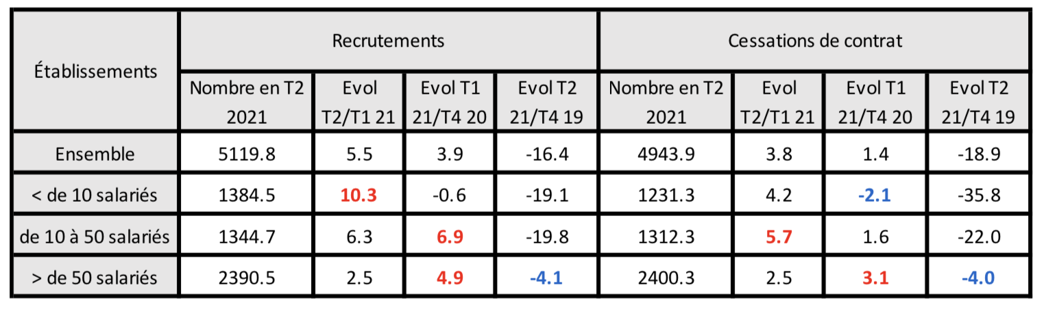 Autrement dit, les grands établissements ont repris plus vite les recrutements que les plus petits, et se rapprochaient bien plus pour les cessations de contrat en T2 2021 comparé à T1 2019 que les moins de 10 salariés.