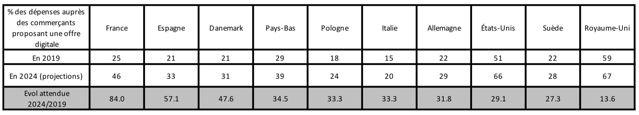 ♦ La progression des ventes en ligne attendues entre 2019 et 2024 sont particulièrement importantes en France, en Espagne, au Danemark et peu au Royaume-Uni.