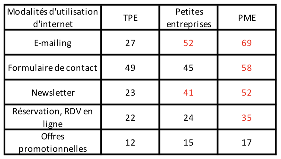 1/3 n’utilisent pas d’outils en ligne pour développer leurs ventes.♦ Ceux qui le font ont recours d’abord à l’e-mailing (entre 27 et 69%), puis au formulaire de contact (49-58%), devant la newsletter (23-52%). Les TPE utilisent beaucoup moins ces différentes formules (prend-t-on en compte toutes les TPE ou seulement celles qui y ont recours ?)
