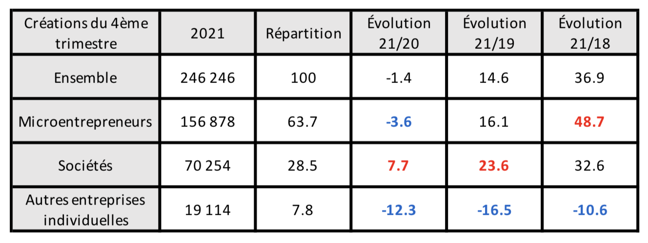 ♦ Les microentrepreneurs sont en baisse, plus encore au dernier trimestre 2021 (-3,6%), alors que les sociétés progressent de 7,7% pendant cette même période.