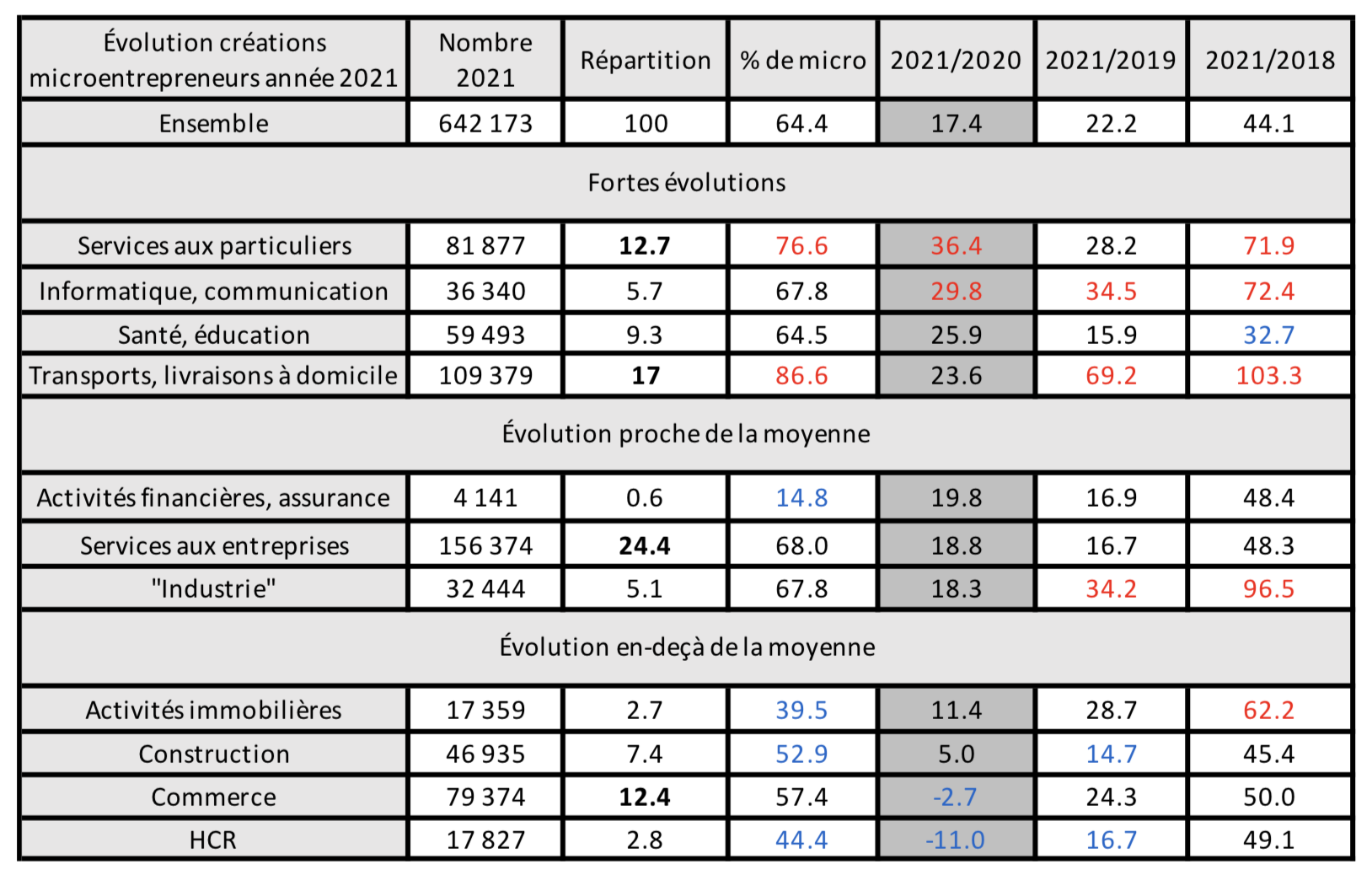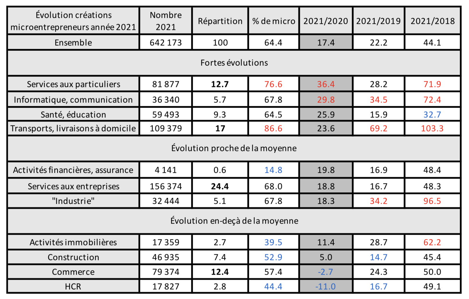 Paradoxalement, certaines activités très inscrites dans la microentreprise ont aussi connu une belle évolution 2020/2021 dans le champ des entreprises classiques, tels les transports avec les livraisons à domicile (modalité pour affirmer davantage son projet d’entreprise ?).